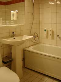 (上・左)デジタルカメラのオート・ホワイトバランスが「ON」になっていても、白熱電球の黄色を完全に取り除くことができませんでした。 (上・右)明るく、清潔感のあるバスルームになりました。