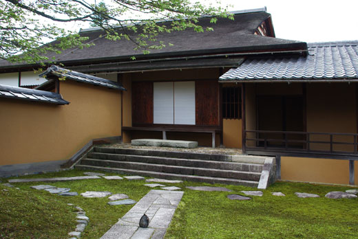 (作業内容)画面中央部から右側の垂直線が歪んでいます。最初にこの歪みを補正して(2枚目が補正済み画像)、庭の苔と画面上部の枝の葉を補正していきます。春まだ浅い季節に写したお寺の写真が、初夏の景色になりました。